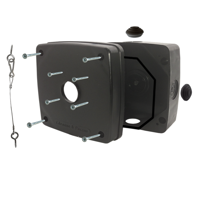 Монтажная коробка ST-K01 PRO (черная), Универсальная монтажная коробка для видеокамер охранного наблюдения, предназначена для установки и подключения видеокамер охранного видеонаблюдения, Габаритные размеры: 140х140х66 мм, Максимальная нагрузка: 2,5 кг, Пластик, Цвет: черный, Рабочая температура: -50…+60°С, Степень защищенности: IP 66, Вес нетто: 0,23 кг, Комплектность: Шайба уплотнительная-2шт.,Сальник для ввода гофротрубы-2 шт.,Саморез (крепл. кам.) 3,9х16 мм-4шт.,Саморез (креп.крыш.) 4х40 мм-4шт.,Саморез (креп.к стене) 4х60 мм-4шт.,Дюбель распорный 6*35 мм-4шт.,Шнур уплотнительный-1шт.,Карабин тип А-1шт.,Кольцо шуруп 3х15 мм-2шт.,Тросик-1шт.,Сальник PG-7-1шт.,Паспорт